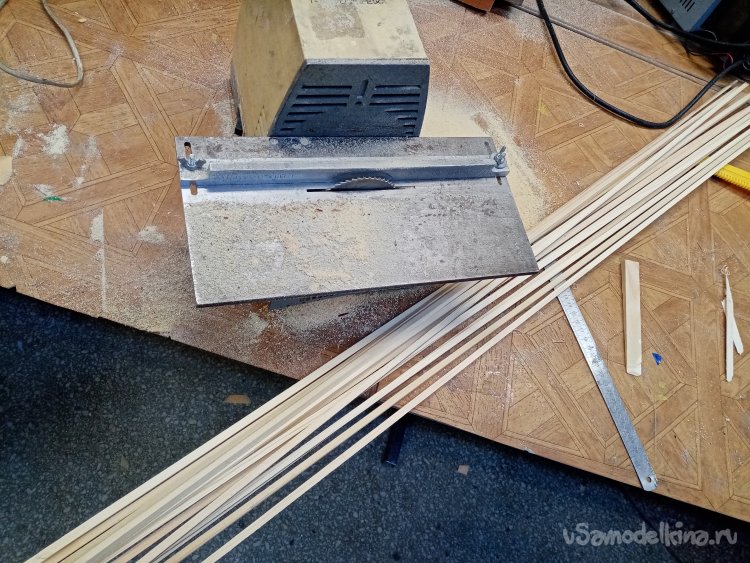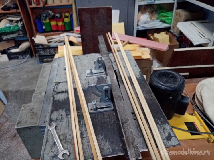 Изготовление начинаю с выбора дерева. Бруски должны быть ровные, без косослоя, достаточной длины. Весьма трудная задача. Перевернул всю моделку, но решение одну хорошую доску. Жалко однако было пускать ее на стрелы. Можно нарезать много реек под самолеты. Решение принято, распилил на бруски размером 10х10 миллиметров.