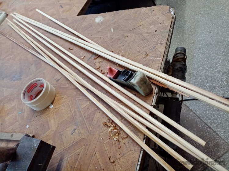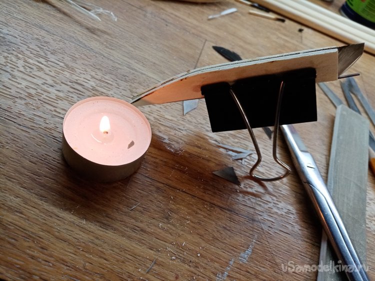 После тщательного осмотра и проверки заготовок оказалось несколько кривых палочек. Но это не большая проблема. В прошлой жизни нагревал дерево над костром и выпрямлял в горячем состоянии. Костер в гараже? И фена строительного не обнаружилось. Пошарил по углам, обнаружил несколько свечек. Тоже вариант. Нагрев и выпрямление прошли без проблем, только слегка медленно.