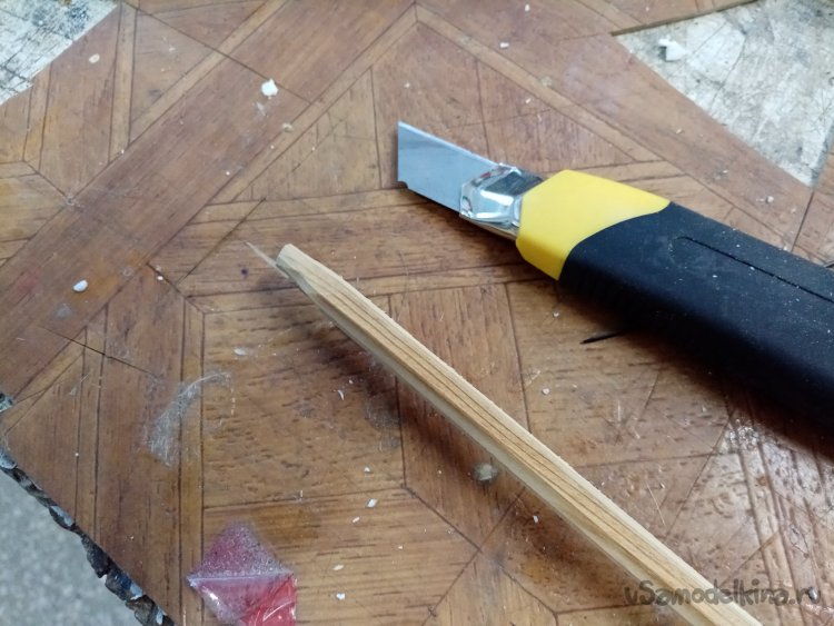 Затачиваю кончик будущей стрелы при помощи канцелярского ножа. Получается не очень хорошо, поскольку его основная функция это резка. И при строгании лезвие гнется. Даже можно сломать. Как всегда, нож с более основательным лезвием куда-то спрятался, не смог его найти в нудный момент.
