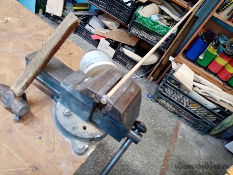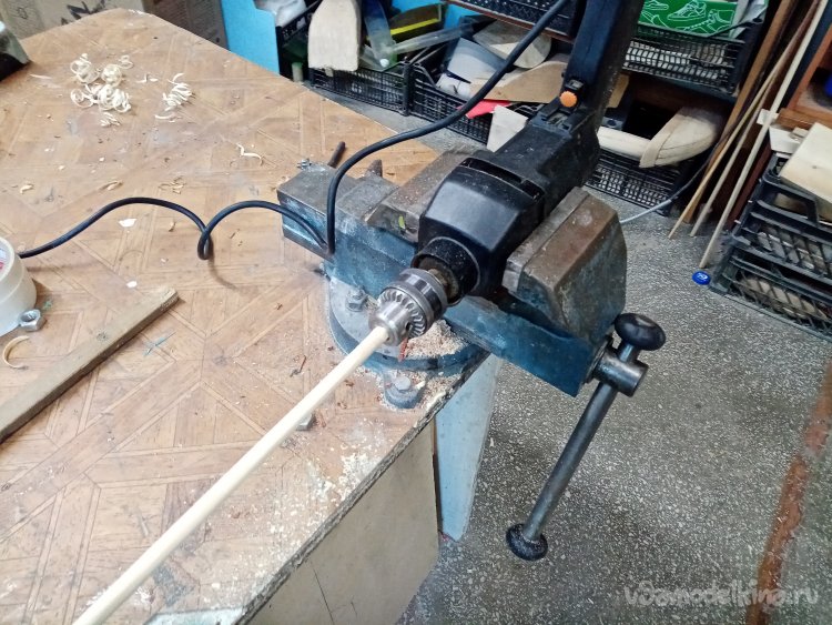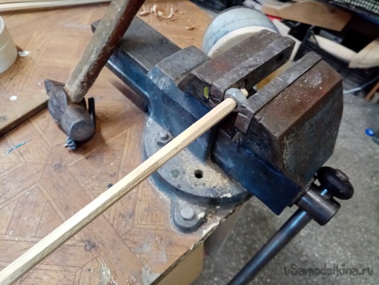 Все подготовительные процедуры нужны для протаскивания деревяшки через гайку с резьбой на 10. Которую зажал в слесарных тисках. Но протащить с первого раза не удалось, поскольку деревяшка постоянно выкручивалась из патрона дрели. Если сильно зажать, крошилась.