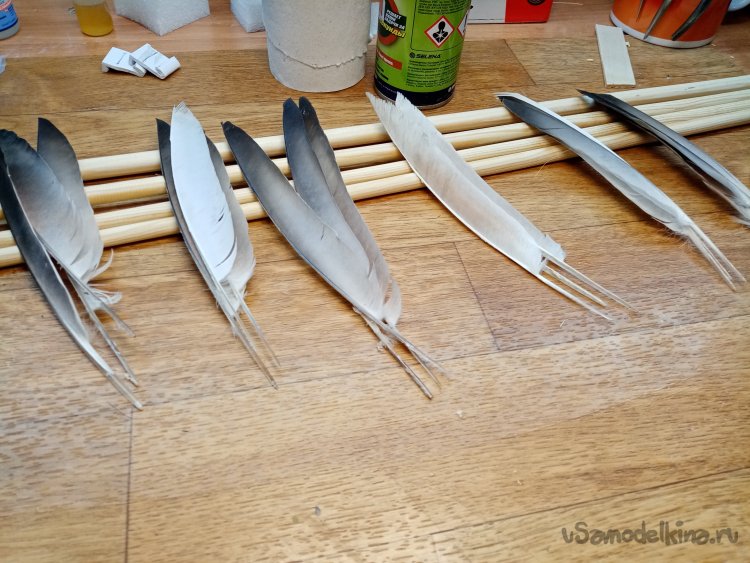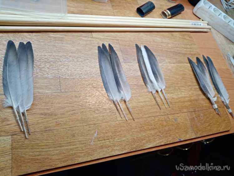 Причем использую только широкую половику пера. Нарезал заготовок на девять стрел.