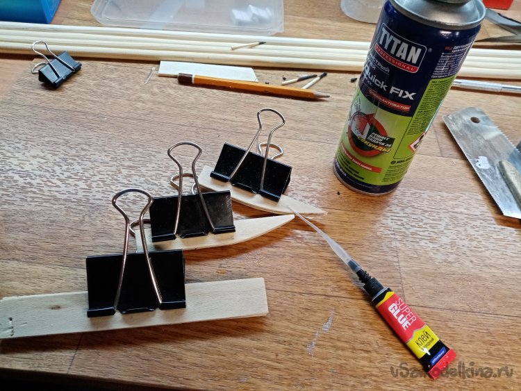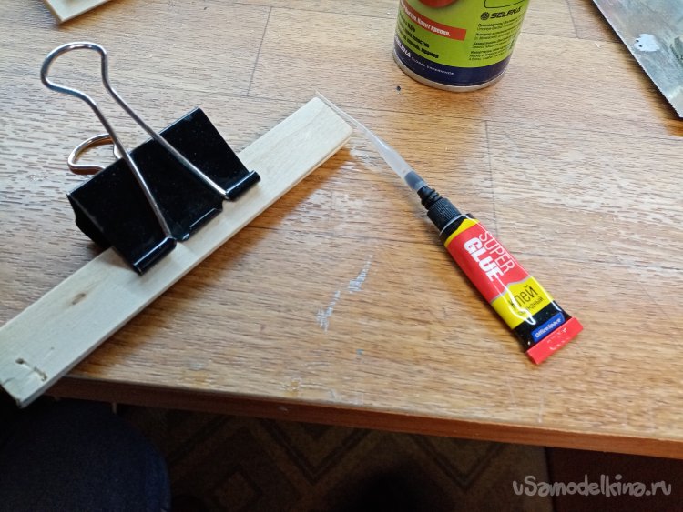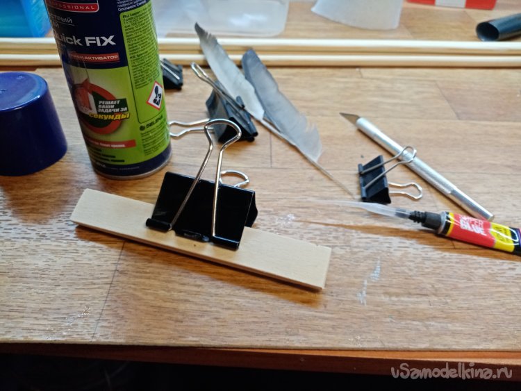 Фиксировать перья буду при помощи канцелярских зажимов. Которые приклеиваю к деревяшкам циакрином.