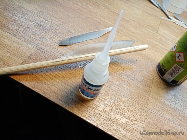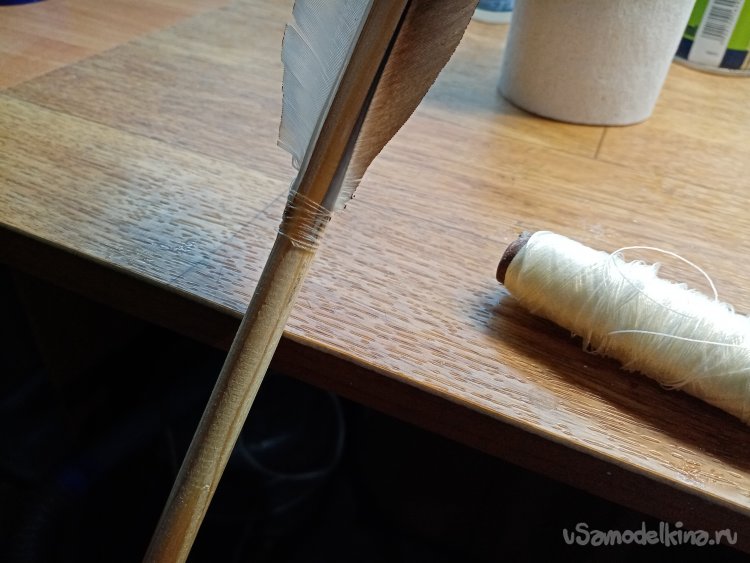 Оперение приклеено, но есть тонкость. Во избежание повреждений приматываю передний и задний конец пера при помощи капроновых ниток и проливаю циакрином.