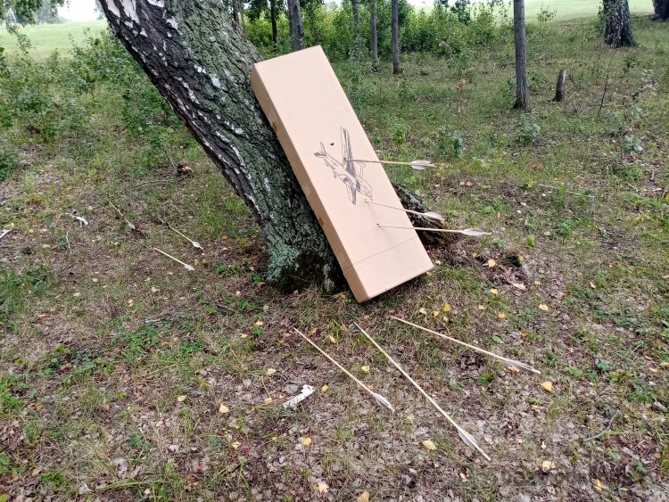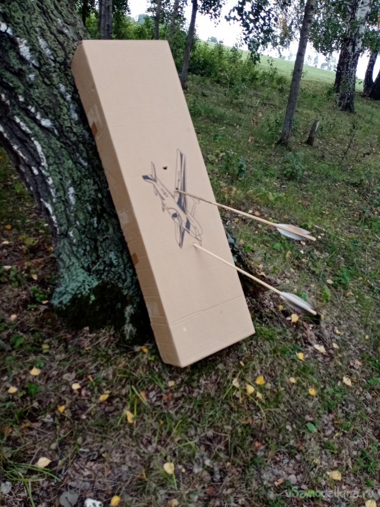 Коробку от самолетика набиваю еще дополнительно листами картона. Пустую стрелы пробивают насквозь с 35 метров. Не смотря на то, что тупые.