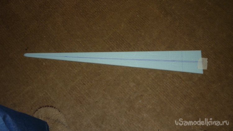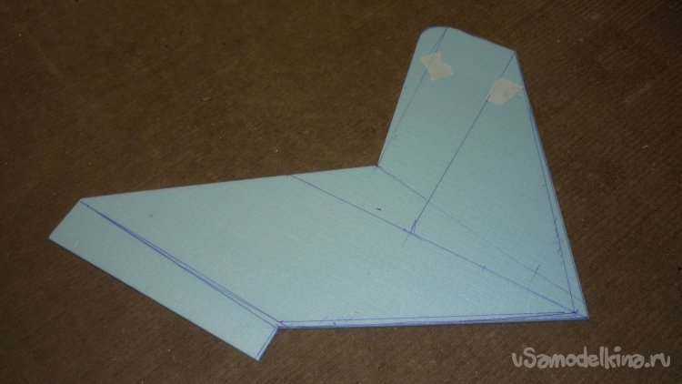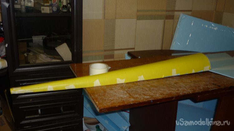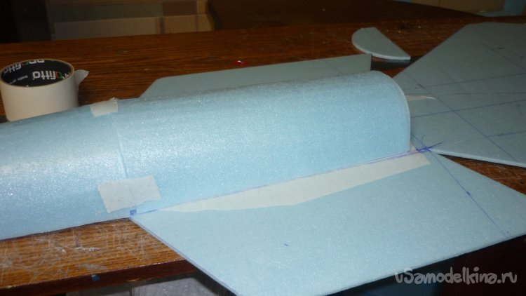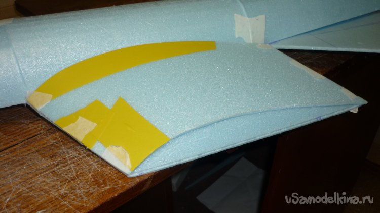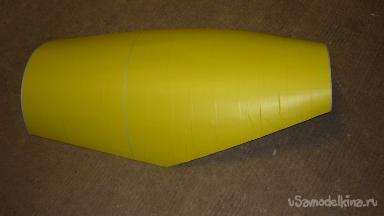 Вырезал заготовку внешней обшивки фюзеляжа, обтянул скотчем, во избежание трещин при изгибе.