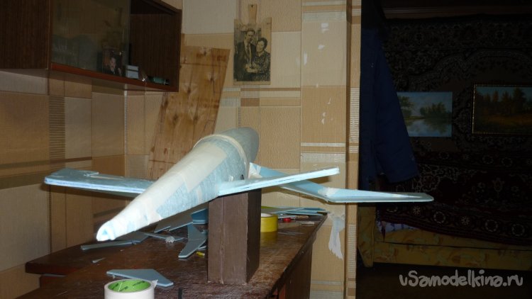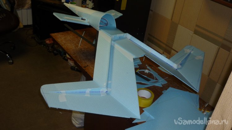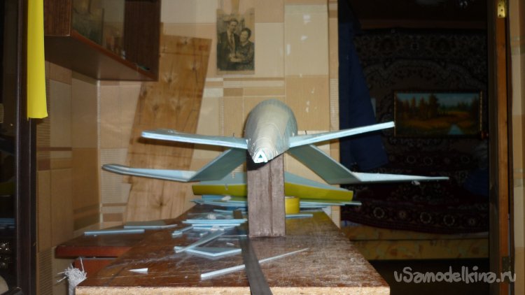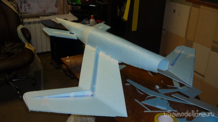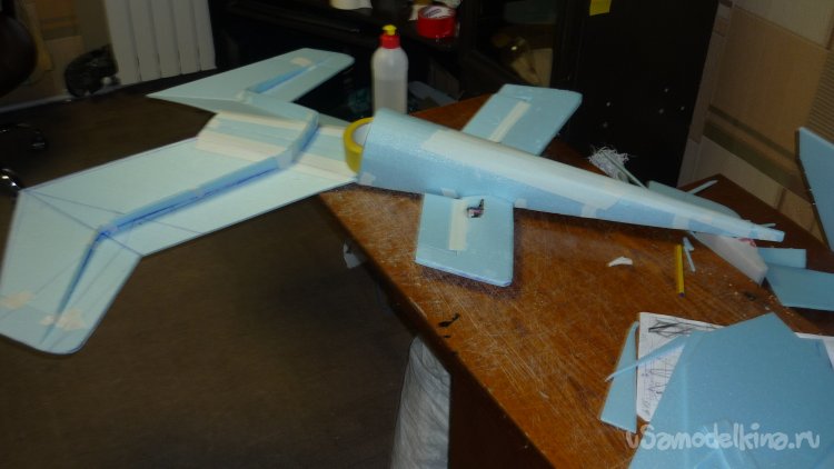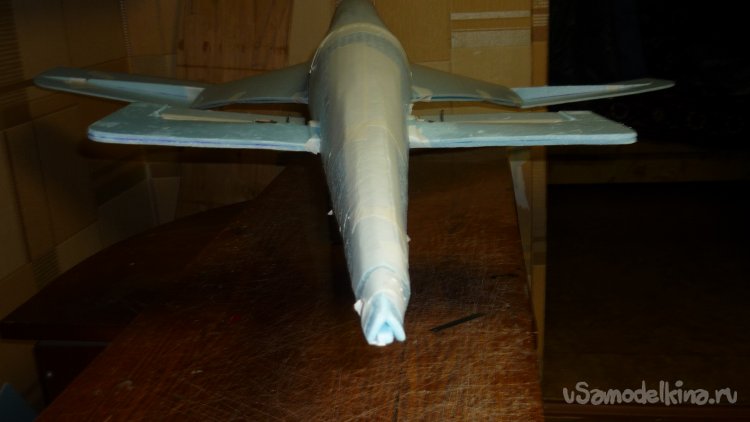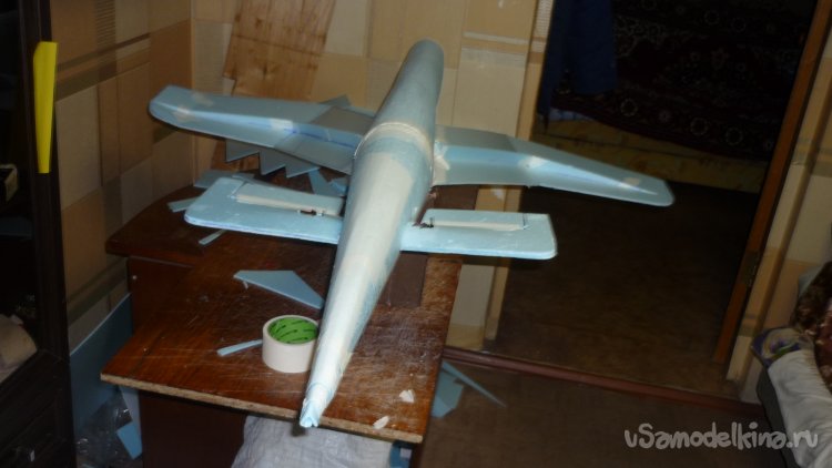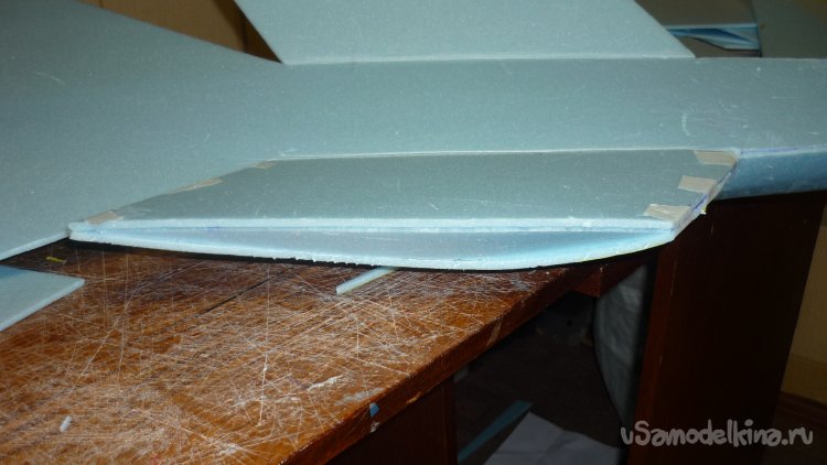 Вырезал, подогнал по размеру и вклеил внешнюю обшивку фюзеляжа в средней и хвостовой части модели.