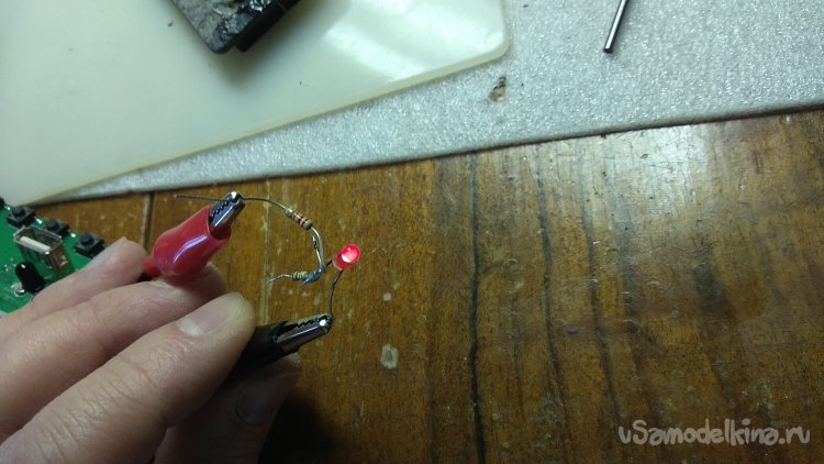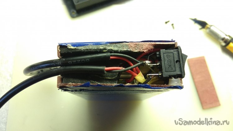 Припаиваю плюсовой вывод индикаторного светодиода к выключателю, так ближе. Пришлось, правда, снимать термоклей с контакта выключателя, что оказалось не таким простым делом.
