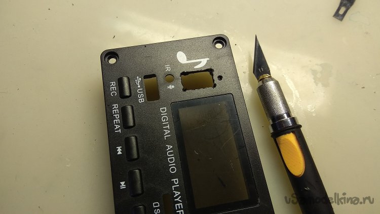 Есть вариант поставить индикатор сзади, возле разъема зарядки, но им будет немного неудобно пользоваться, придется постоянно брать колонку в руки, переворачивать. Решил поставить индикатор снизу, под декодером. Просто приклеить на корпус не наш вариант, торец индикатора, склеенный из двух частей и плёнки, выглядит так себе. Индикатор можно утопить заподлицо. Размечаю резаком место установки.