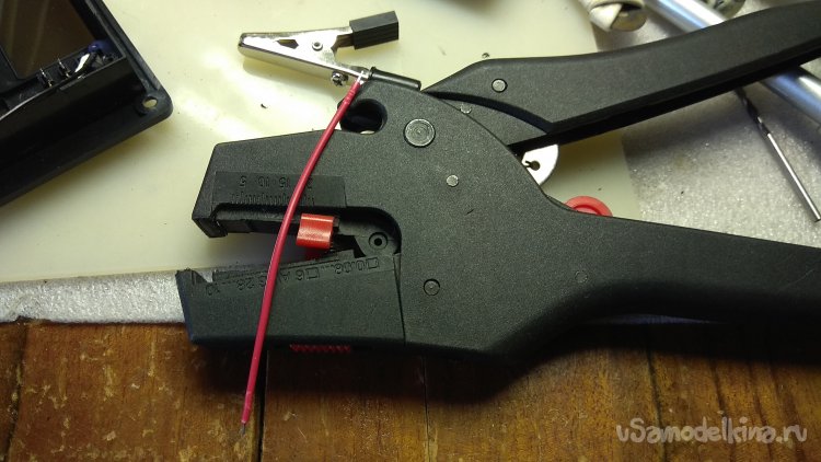 Подключаем выключатель к плате. Для зачистки проводов почти всегда пользуюсь обыкновенными кусачками, но есть более удобный инструмент, стриппер, особенно когда не получается руками удержать зачищаемый провод. Паяльником тоже много лет зачищал провода, но результат выглядит не очень красиво и жало пачкается.