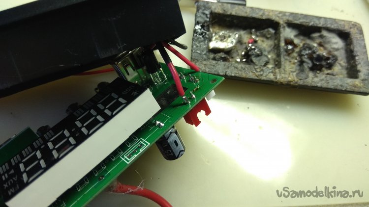 Второй провод припаиваю на зачищенную и залуженную дорожку. Фиксирую и изолирую место пайки всё тем же термоклеем.