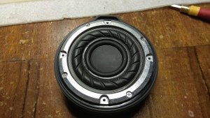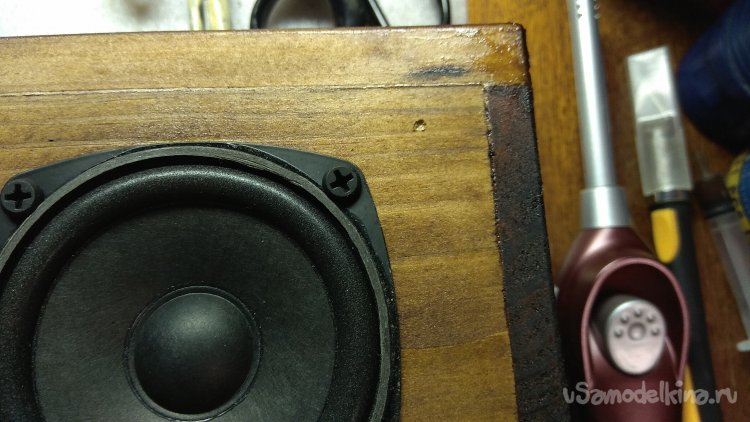 Можно начинать сборку колонки. Прикрутил саморезами динамики. Здесь видно, как сорвался в корпус шуруповерт. Вроде саморез практически не болтался на бите, но всё равно сорвался. Хорошо, что колонка чисто для себя, а не из редкой древесины для клиента. Остальные саморезы закручивал отверткой, на ней саморезы держались отлично.