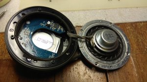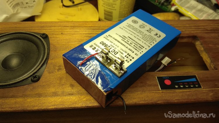 Немного рассказывал про него в первой части. Ёмкость у него в принципе достаточная для нескольких часов работы при средней громкости. Снимаю часть корпуса со стороны проводов.