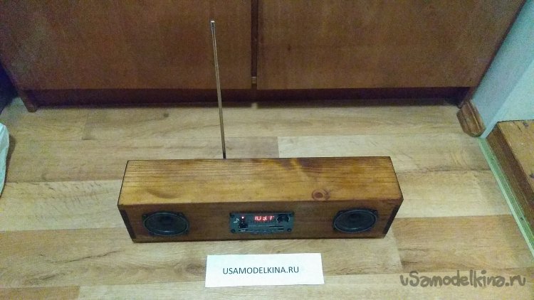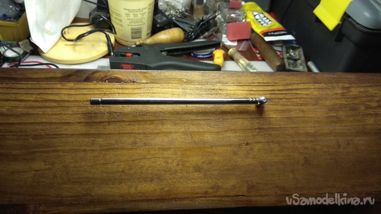 В предыдущей части я ограничился просто куском провода. Работало это не очень. Встроенную антенну не покрутишь, только с колонкой. Нашел в закромах небольшую телескопическую антенну. Прикинул, как её установить. Среди всех вариантов понравилась установка на стойку, вот в таком виде. По бокам антенны установлены разрезные шайбы гроверы.