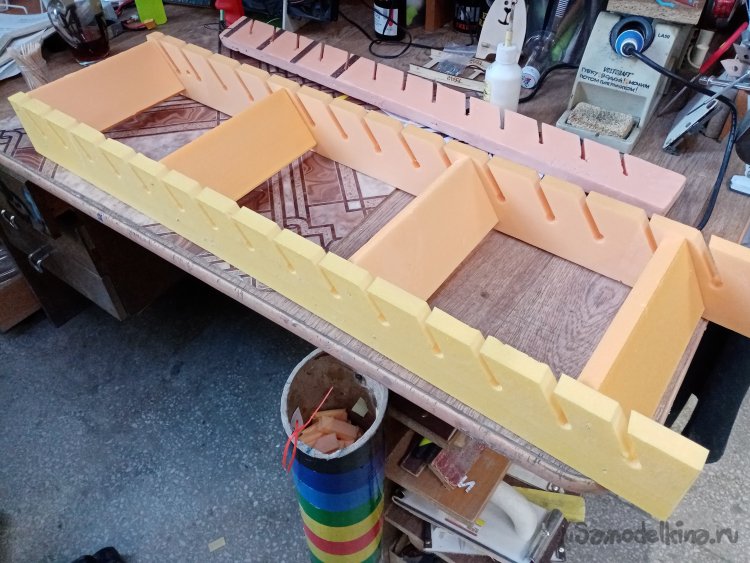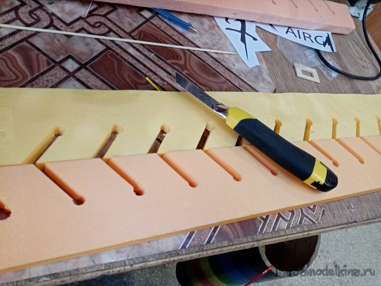 Выдвинув лезвие канцелярского ножа на полную длину, по линейке прорезаю пазы в стенках.