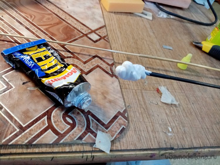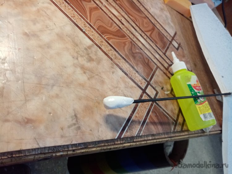 Иногда даже приходится менять носовой грузик. По правилам соревнований на носовой части должен быть амортизатор из мягкого материала. Мы для этой цели используем герметик для ванн белого цвета. Изначально нужное количество герметика наносится на фюзеляж. Некоторое время спустя мокрыми пальцами формируется капля грузика обтекателя. Спустя пару дней герметик окончательно застывает.