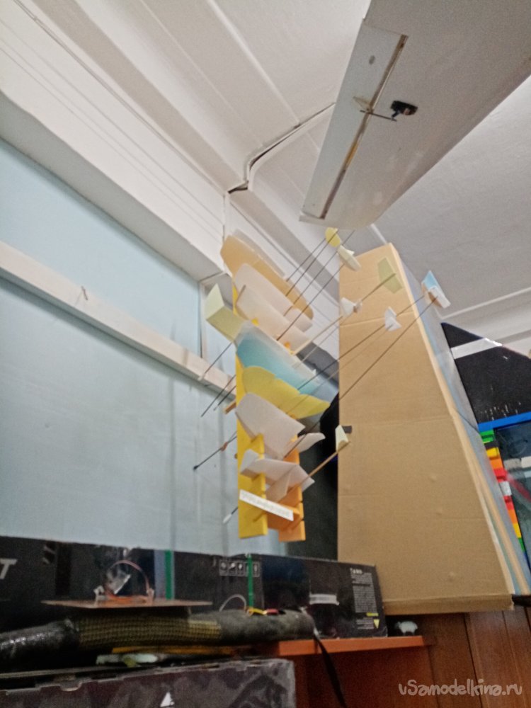 Сейчас встал вопрос крепления. Параллельно и перпендикулярно. В некоторых местах моделки натянуты тросики. На них подвешиваются модели, экономия пространства на лицо. Потолки у нас в три с половиной метра. Это позволяет использовать верхнее пространство в качестве временного склада моделей. Решил закрепить стеллаж с моделями за нужный тросик.