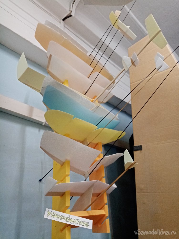 В прорези конструкции вставляю крылья самолетиков. Закреплены достаточно прочно. Затем подвешиваю этот стеллаж на тросик под потолок.