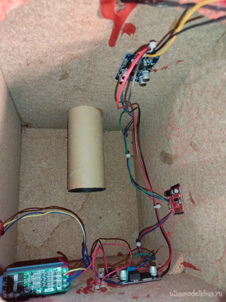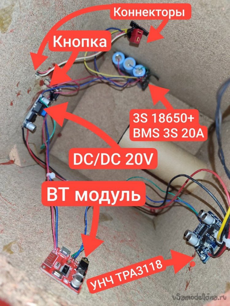На модуле преобразователя нужно выставить напряжение 20-21Вольт при динамике 8Ом,как в моем случае.А вот для спротивление динамика в 4Ом предел диапазона напряжений 17-19Вольт.Или поставте хоть какое-то пасивное охлаждение на микросхему тогда уже можно подовать до 22.5-23Вольт.Иза этой ошибки у меня случился тепловой пробой микросхемы.Розряжать батарею элементов питания до 9.6В, а заряжать до 12.6В.Примерное время роботы в нормальном режиме пользование это 1.5 часа.