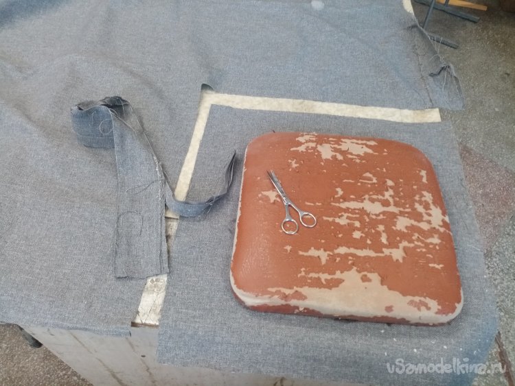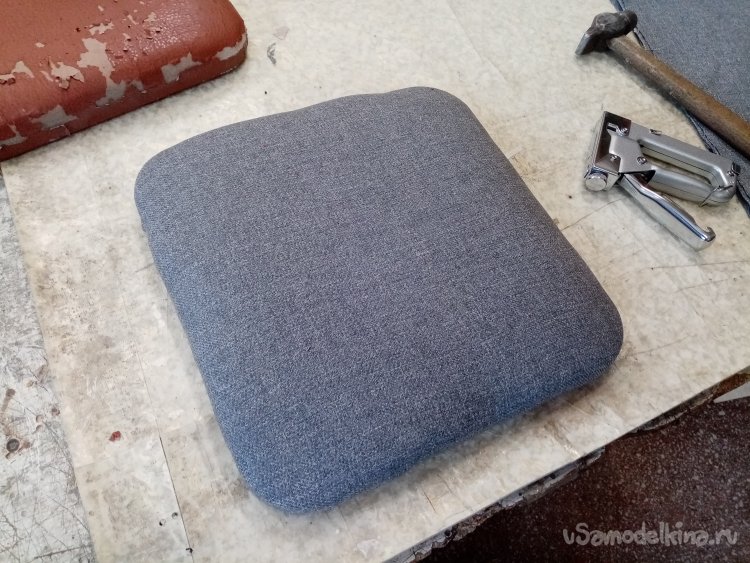 Поскольку сидений не четное количество решил разнообразить серую картину ряда одной коричневой точкой. Поскольку опыт восстановления стульев. Диванов и офисных кресел у меня имеется. Обтяжка не вызвала особых проблем. Хотя с закругленными краями пришлось немного повозиться.