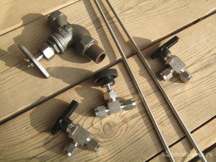 Фото 6. Дополнительные части барботера – пара шаровых и игольчатый краники из стойкой нержавейки и с цанговым металлическим зажимом трубки, сами калиброванные толстостенные трубки (сварка) из такой же нержавейки, «черная» резьба 1/2" с концом под сварку, чугунный кран 1/2" – вариант заливной горловины