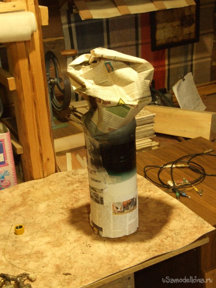 Фото 15. Пояснительную надпись «Бензин» сделал через имеющийся самодельный бумажный трафарет, оставшийся в наследство от взрослого карбюратора. Замотал и залепил аппарат вокруг трафарета газетами, пшикнул из баллончика с черной краской