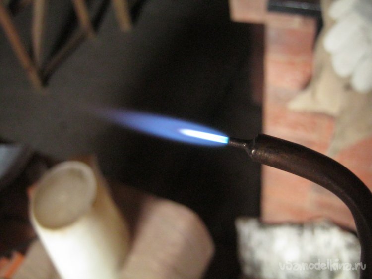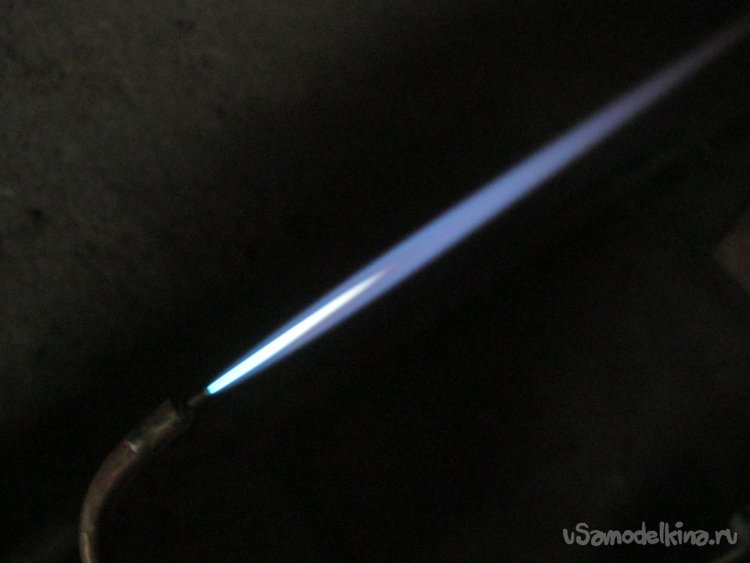 Моя горелка имеет два сменных сопла – 0,3 мм, 0,7 мм. Поток газа регулируется игольчатым краником на ручке. На фото – факелы гремучего газа сильно обогащенные парами бензина.