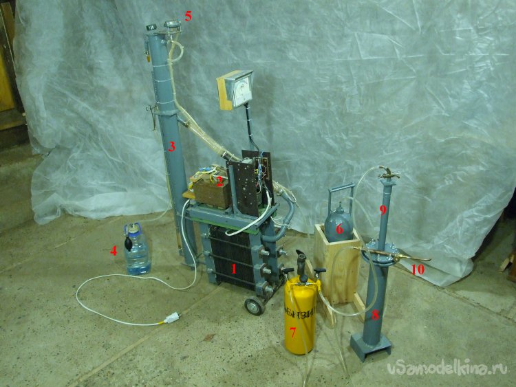 Фото 22. Стационарный электролизер в сборе, где: 1 – реактор, 2 – его блок питания, 3 – внешний бак электролита с фильтром-отделителем щелочной пены (верхняя часть), 4 – питатель с ручной грушей-нагнетателем, 5 – реле давления, 6 – водяной затвор по схеме склянки Тищенко, 7 – барботер с бензином, 8 – осушитель газа, 9 – тонкий фильтр сухой щелочи с пробковым краном-отсекателем, 10 – горелка со сменными соплами и огнегасящей набивкой в ручке из специально обработанной медной «путанки»