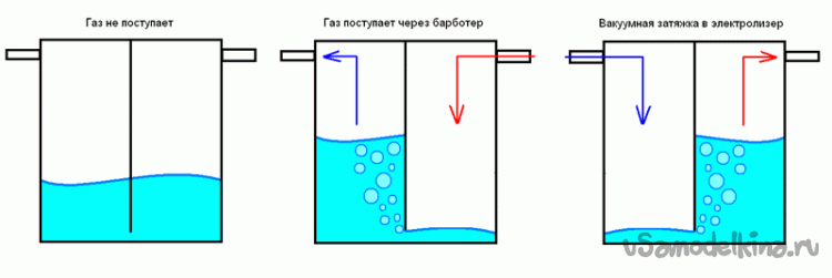 «Система» в электролизере находится под избыточным давлением, а при работе реактор нагревается. После выключения же остывает и вероятно разрежение способное затянуть рабочие жидкости по шлангам из аппаратов в соседние. Явление это вредное, с ним следует бороться. Избежать попадания технической воды из затвора (Рис. 2, поз. 6) в реактор (Рис. 2, поз. 1) с электролитом на основе дистиллированной воды, позволило выполнение затвора по схеме склянки Тищенко работающей в любую сторону (Рис. 3).