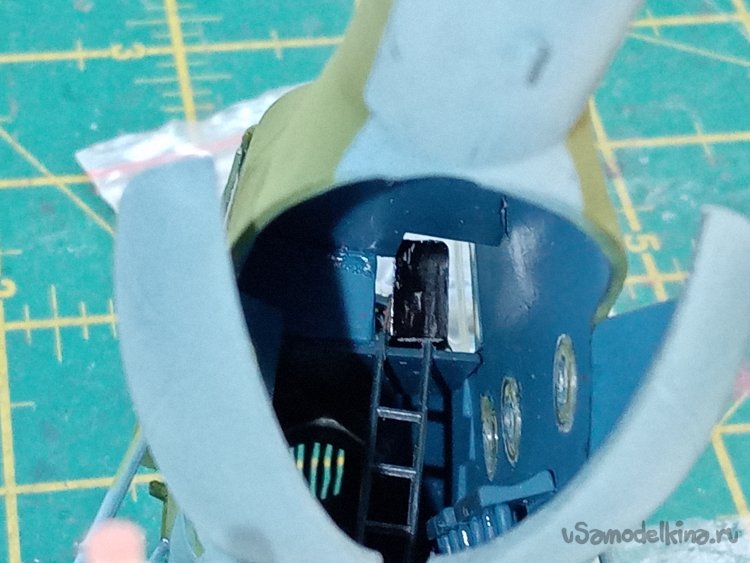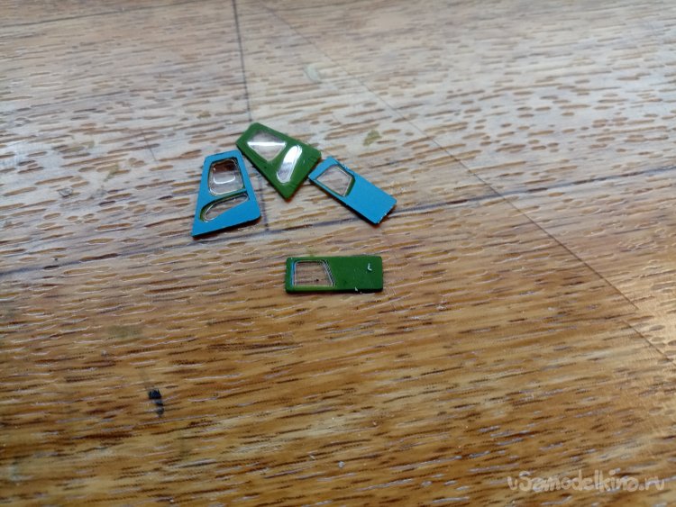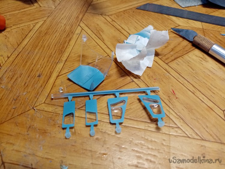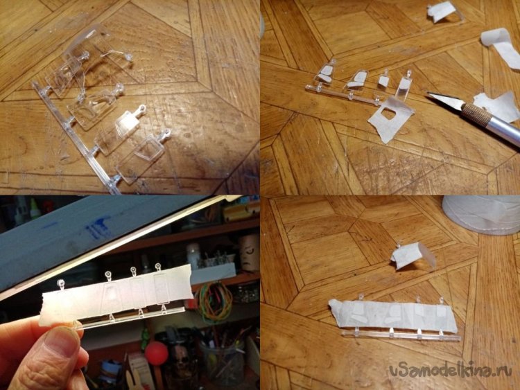 Начинаю работу с дверей. В данной модели они прозрачные полностью. Значит нужно красить. Заклеиваю прозрачные детальки отрезком малярного скотча, прорезаю маски на иллюминаторы. Первым делом буду закрашивать внутренность кабины.
