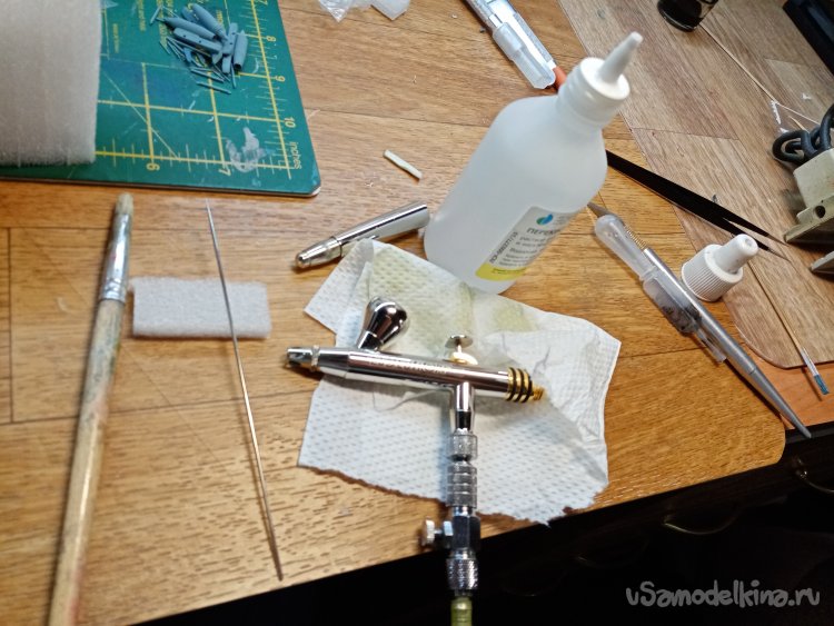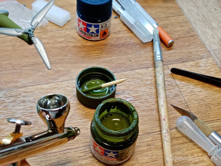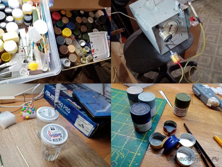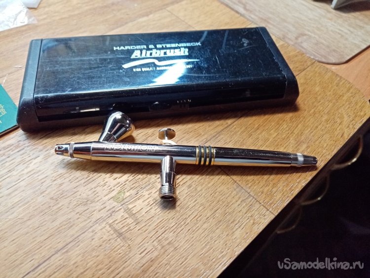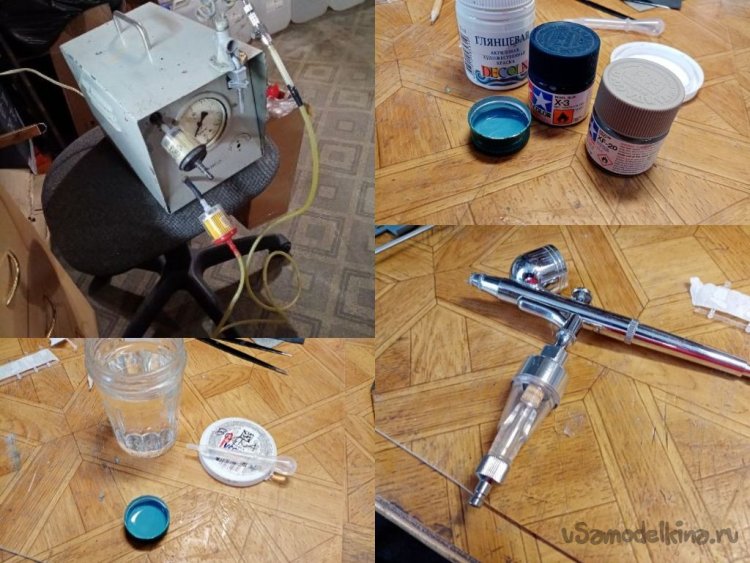 В наличии мой практически бесшумный компрессор и отличный аэрограф «СОЛО ЭВОЛЮШЕН». Этим распылителем окрашиваю все мелочи. Ну и конечно краска акриловая «ТАМИЯ». Просто великолепная, но дорогая зараза.