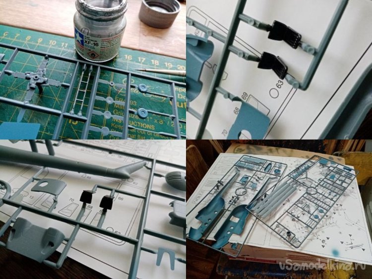 Окрашиваю серной матовой шины шасси и начинаю собирать всю мелочевку стоек. Заодно переднее остекления ниши пулеметчика и сам пулемет. А также выхлопные трубы двигателя.