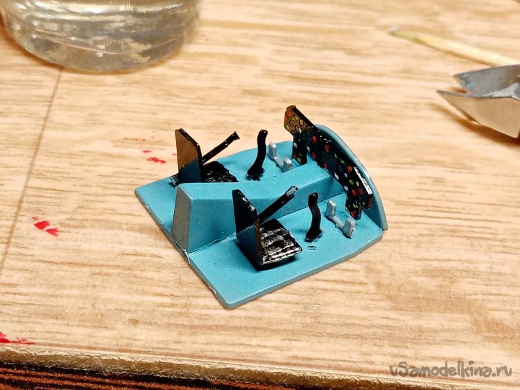 Собрал полик, и весь интерьер кабины пилотов. Все внутреннее оборудование не соответствует реальному. Грубо сделано и не на своих местах. При сборке использовал клей для моделей и циакрин.