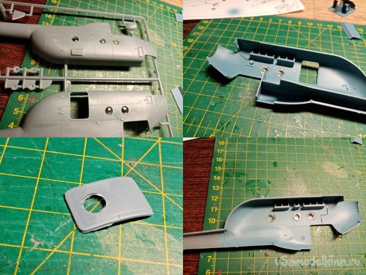 Начинаю собирать корпус. Мои опасения подтвердились, не лезет пилотская кабина. Пришлось много срезать пластика, прежде чем установилась. Копийности конечно нет. Вертолет в два этажа! Из грузового отсека идет лестница в кабину пилотов.