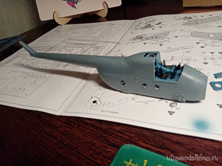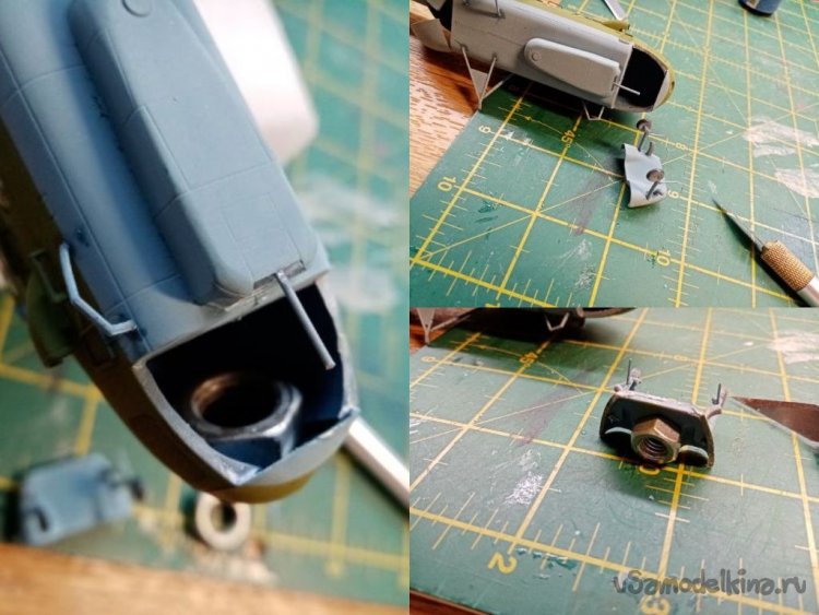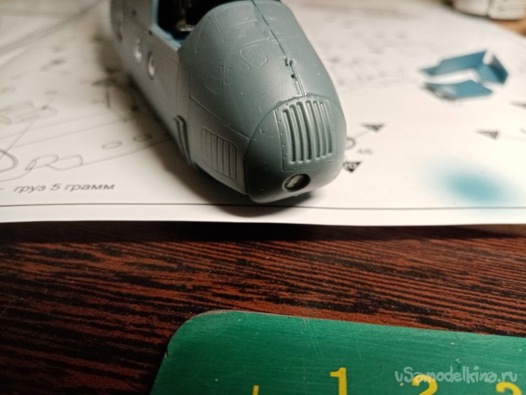 В носовой части приклеил большущую гайку. Иначе вертолет на стоит. Валится на хвост. Ведь у меня нет в модели большущего и тяжелого двигателя в носовой части.