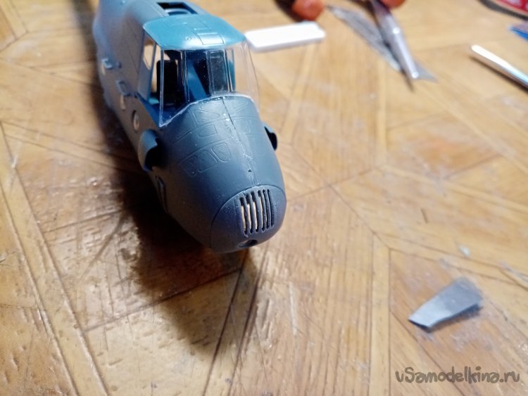 Вся носовая часть в отверстиях закрытых защитными сетками. Это охлаждение этого звездообразного монстра. Пришла следующая мысль. Все прорезать и закрыть тонкой сеточкой. От чайного пакетика.