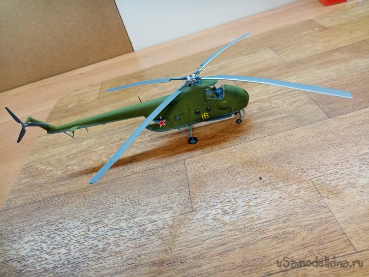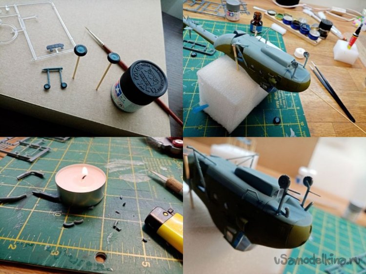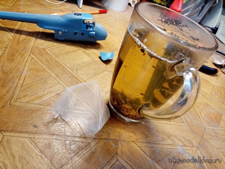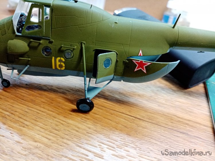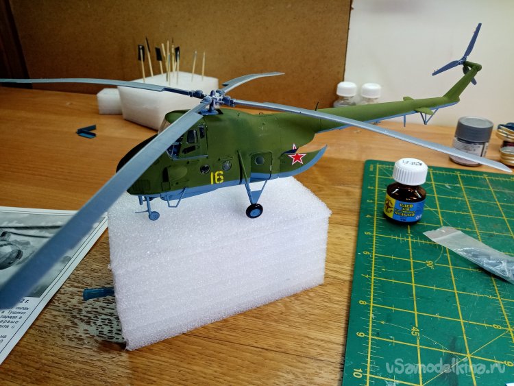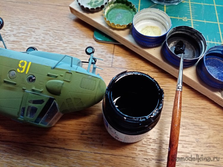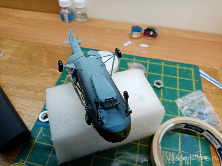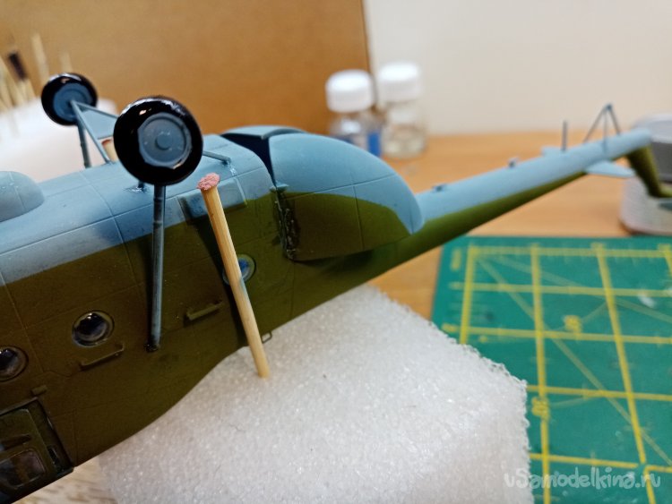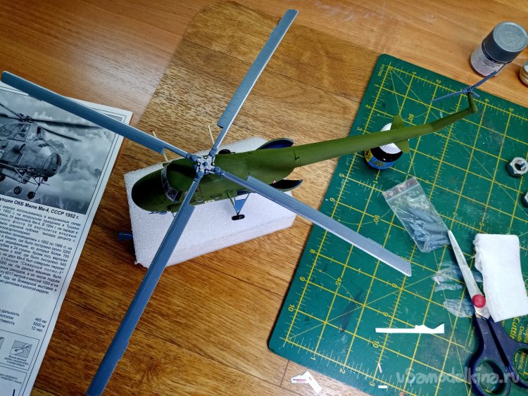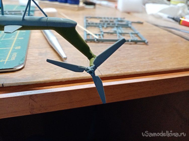 Промываю аэрограф и закрашиваю серебром передние кромки лопастей несущего винта.