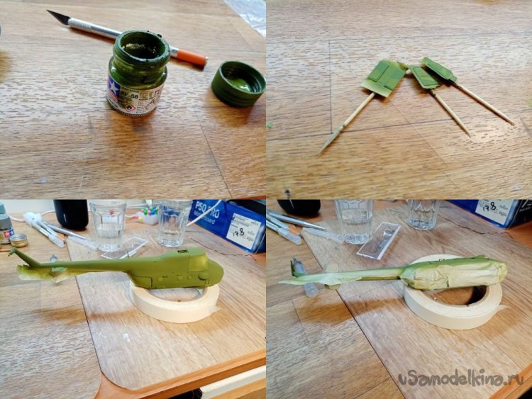 Пошел зеленый тон. Мелкие детали приклеиваю на зубочистки на двойной скотч. Дл удобства удержания и сушки.