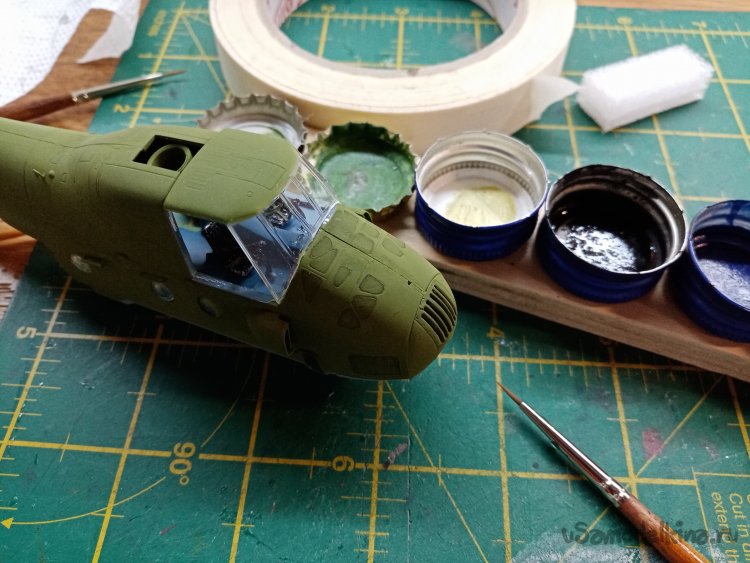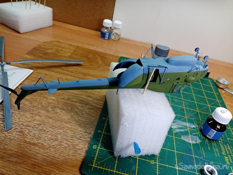 Задул нижнюю часть вертолета голубой, не особенно беспокоюсь о линии сопряжения. Поскольку зеленая спокойно перекроит голубизну.