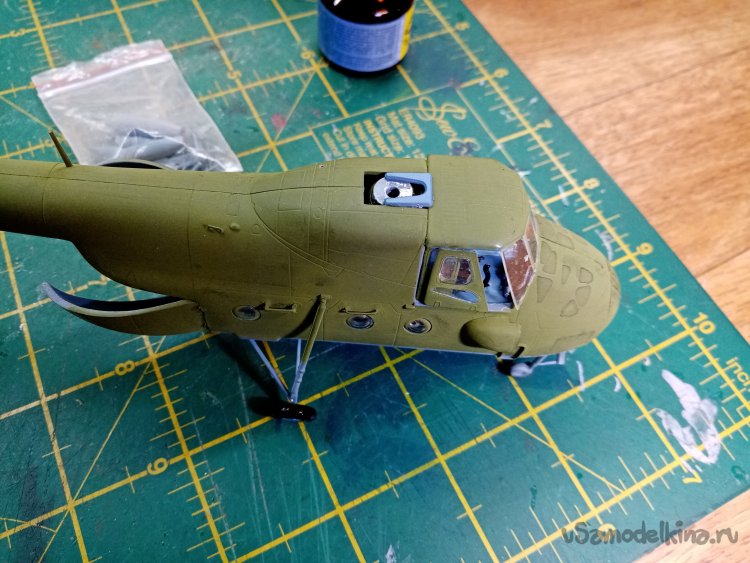 Приклеил нижний обтекатель. И боковые «уши» охлаждения двигателя. Интересная деталь. Внутри конструкции есть мягкое место. Там лежит на животе пулеметчик! Вертолет полон интересного. В носовой части установлен звездообразный двигатель, слегка наискосок! По корпусу проходит туннель с валом тоже наисокок, снизу вверх, передающим момент на несущий винт! Посмотрите на фото 15, между креслами пилотов виден этот кожух вала идущего вверх.