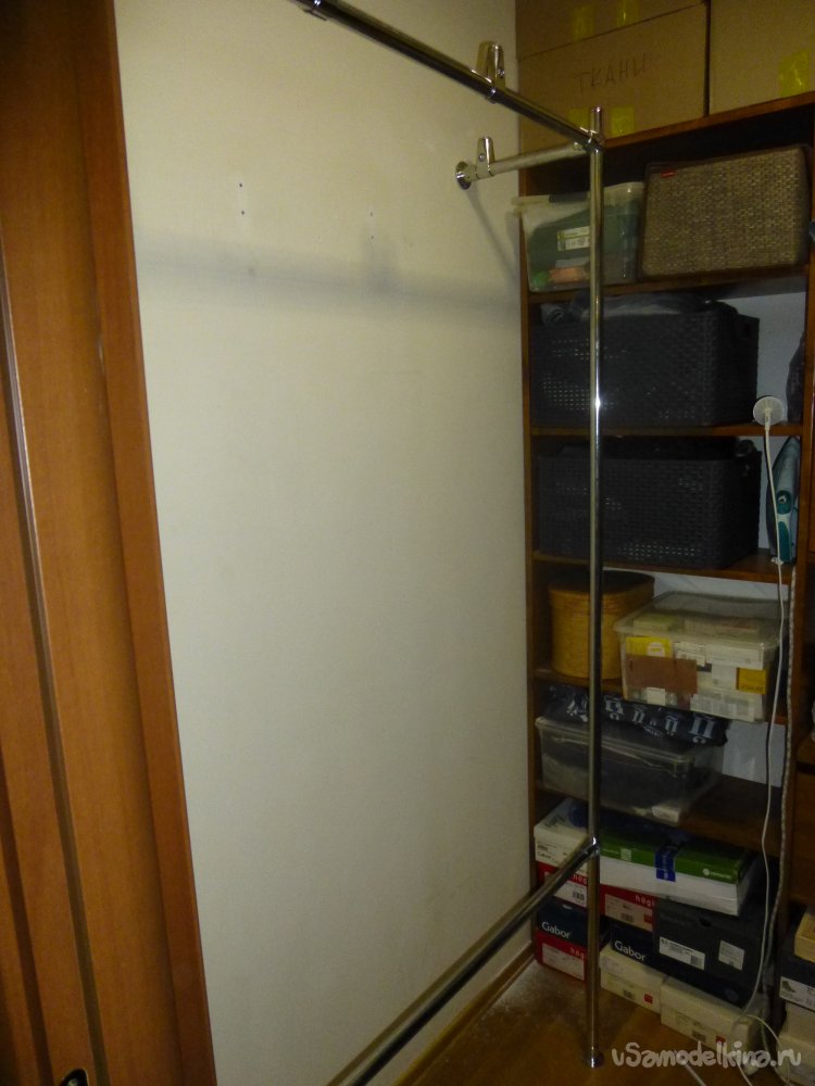 Но вскоре её опять стало не хватать, плюс ей не нравилось, что вешалка постоянно ёрзает. И она стала конючить, чтобы я сделал ей стационарную вешалку. Но как? Закрепить штангу к стенке слева от крючков не составляло проблем. А как с другой стороны крепить к собственно гардеробной? Как вытаскивать коробки с полок?