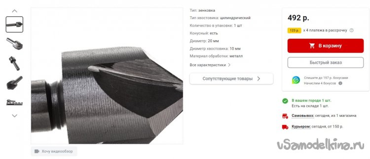 Тут же встал вопрос, чем зенковать отверстия в щите. Диаметр головки винта 20 мм. Такой зенкер в «Всеинструменты.ру» стоит 492 руб., причём это самый дешёвый (у остальных цена переваливает за 1000 руб.). И не факт, что тебе его привезут, т.к. в наличие 1 шт.