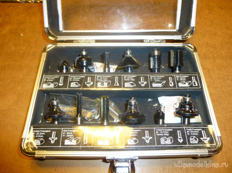 На даче в гараже есть свёрла Ø20 мм и больше (когда тянул проводку, то приходилось в стенах сверлить такие отверстия). Но не поедешь же на дачу за свёрлами из-за 6-ти отверстий, которые нужно зенковать! И тут я вспомнил про замечательный набор для ручного фрезера. Бинго!