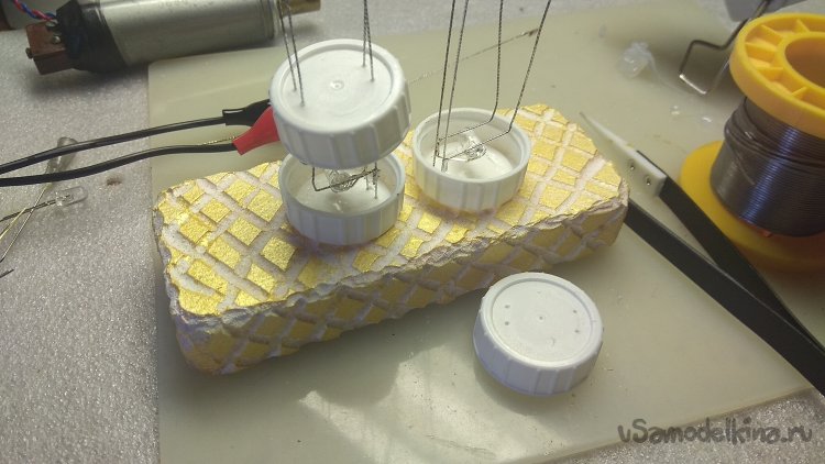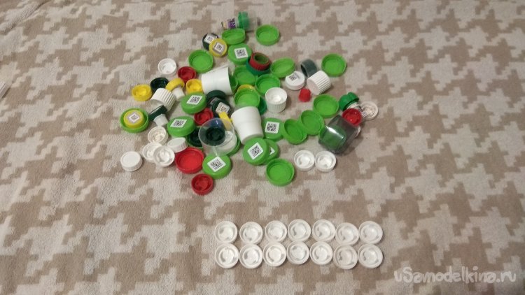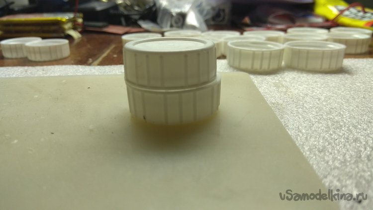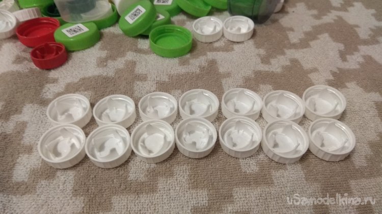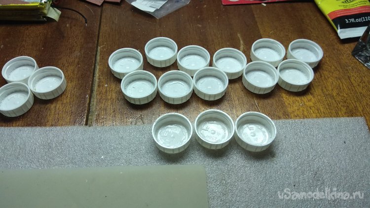 В качестве источников света выступают попарно склеенные крышечки. Четырнадцать белых крышечек от сока нашлись легко. Когда только собирал первые светильники с колоннами, стал собирать разные крышечки. Собралось достаточно много разных видов.
