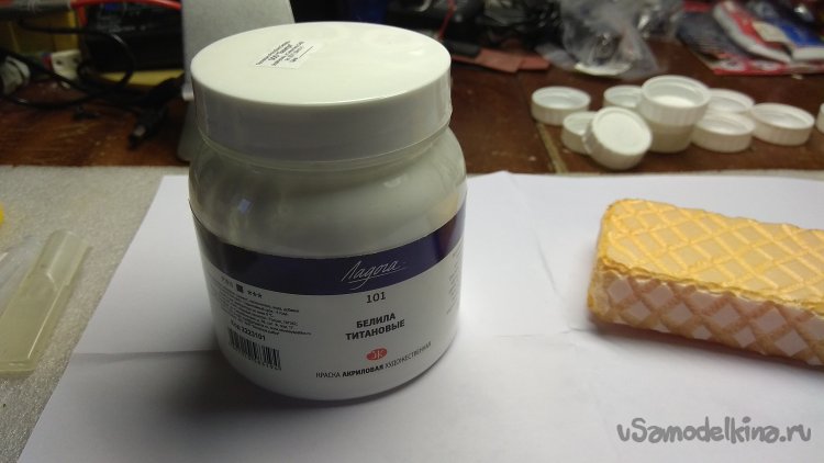 Белая краска очень густая, для покрытия с лихвой хватает одного слоя. Наносил кистью, тщательно втирая краску в углубления.