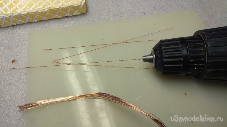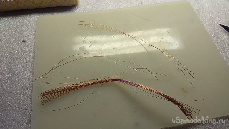Основание высохло, можно заняться сборкой. В качестве проводников сначала хотел использовать одножильную медную проволоку диаметром 0,5 мм, но с нее надо было снимать лак. Для длинного куска проволоки занятие то ещё. Поэтому пошел другим путём, распустил отрезок многожильного медного провода. Если свить по три жилки вместе, это будет достаточно жестко.