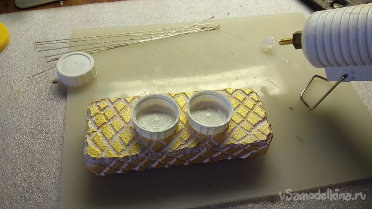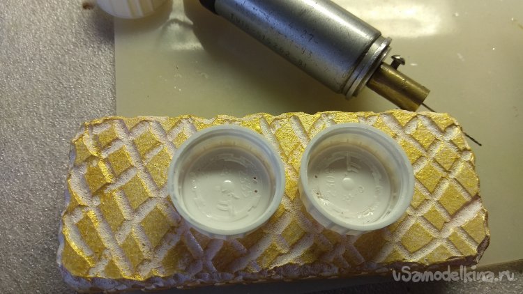 Иголкой проколол отверстия насквозь, сверло насквозь не достало, мешались борта крышечек.