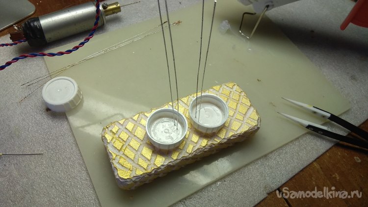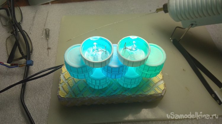 Приклеил первые крышечки. Пользовался термоклеем. Он прозрачный и быстро застывает, что позволяет экономить время монтажа. Даже на фото видно, что приклеил немного криво, но в реальности это не было видно. Возможно, повлиял несимметричный рисунок основания.