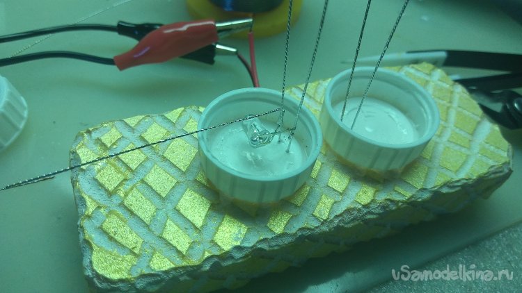 Второй ряд крышек сверлить было интересней. Не стал вымерять расстояние, сверлил на глаз и, понятное дело, с первого раза не попал. Был шанс, что согнув проволочки, можно будет нивелировать неправильно просверленные отверстия. Но увидев, как нижний ряд начинает подниматься от основания, пришлось пересверлить. В крайних крышках зафиксировал проволочки термоклеем, чтобы светодиоды не сместились при возможном падении.