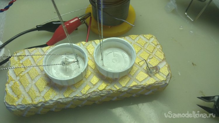 Пометил полярность и припаял провод в основание, чтобы контролировать исправность каждого светодиода перед заклеиванием крышек. Когда все крышки будут склеены, проверять исправность будет поздно.
