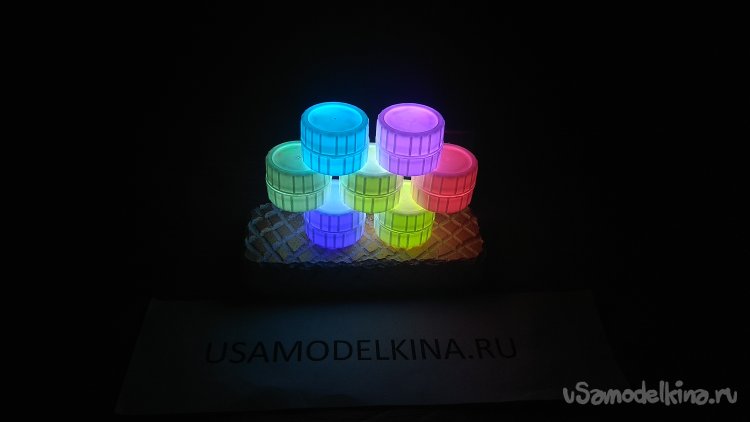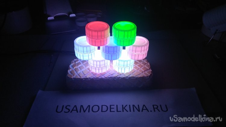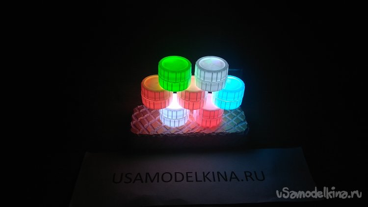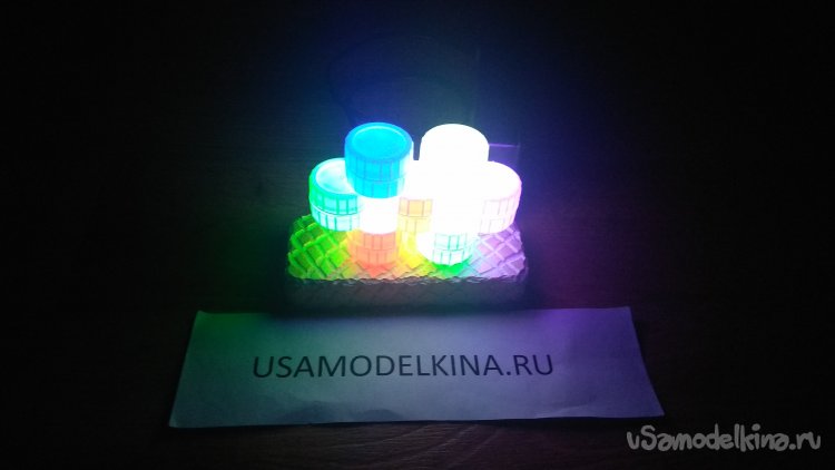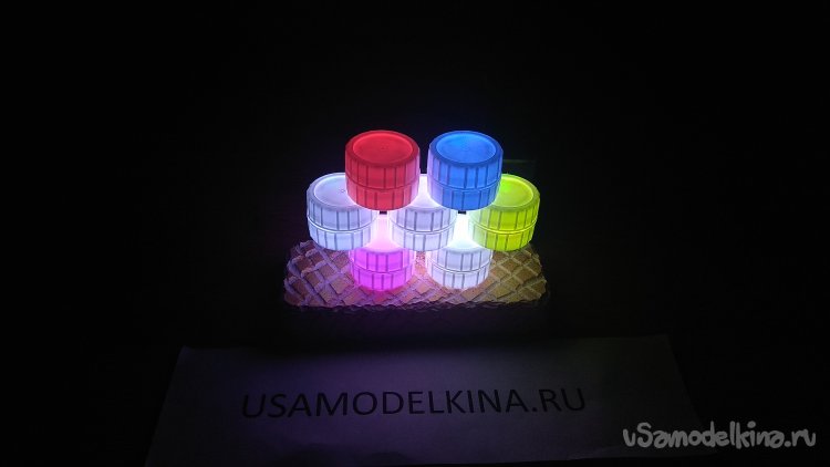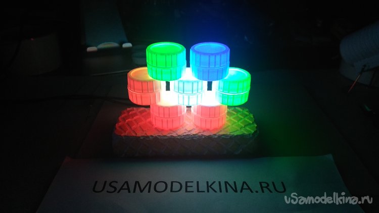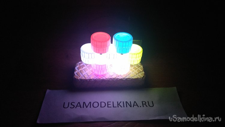 Светит достаточно ярко. Хотелось бы, немного увеличить скорость переключения, но в данном варианте это невозможно. Была мысль применить RGB светодиоды с внешним контроллером с кнопками, а сами светодиоды включить разнофазно, чтобы получить разные цвета в крышках. Там вариантов настроек было бы больше.